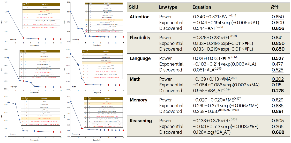 模拟实验结果表明,该方法能够在一定噪声范围内准确识别核心变量并重建预设的技能习得规律方程,验证了所提方法的有效性。在大规模真实认知技能训练数据的应用中,通过该方法发现的技能习得规律在适应度、拟合度等指标上显著优于传统和当前主流学习模型。同时,通过该方法从数据中发现了两类新的认知技能习得规律(对数率与反幂率),并验证了多项先前的研究发现。