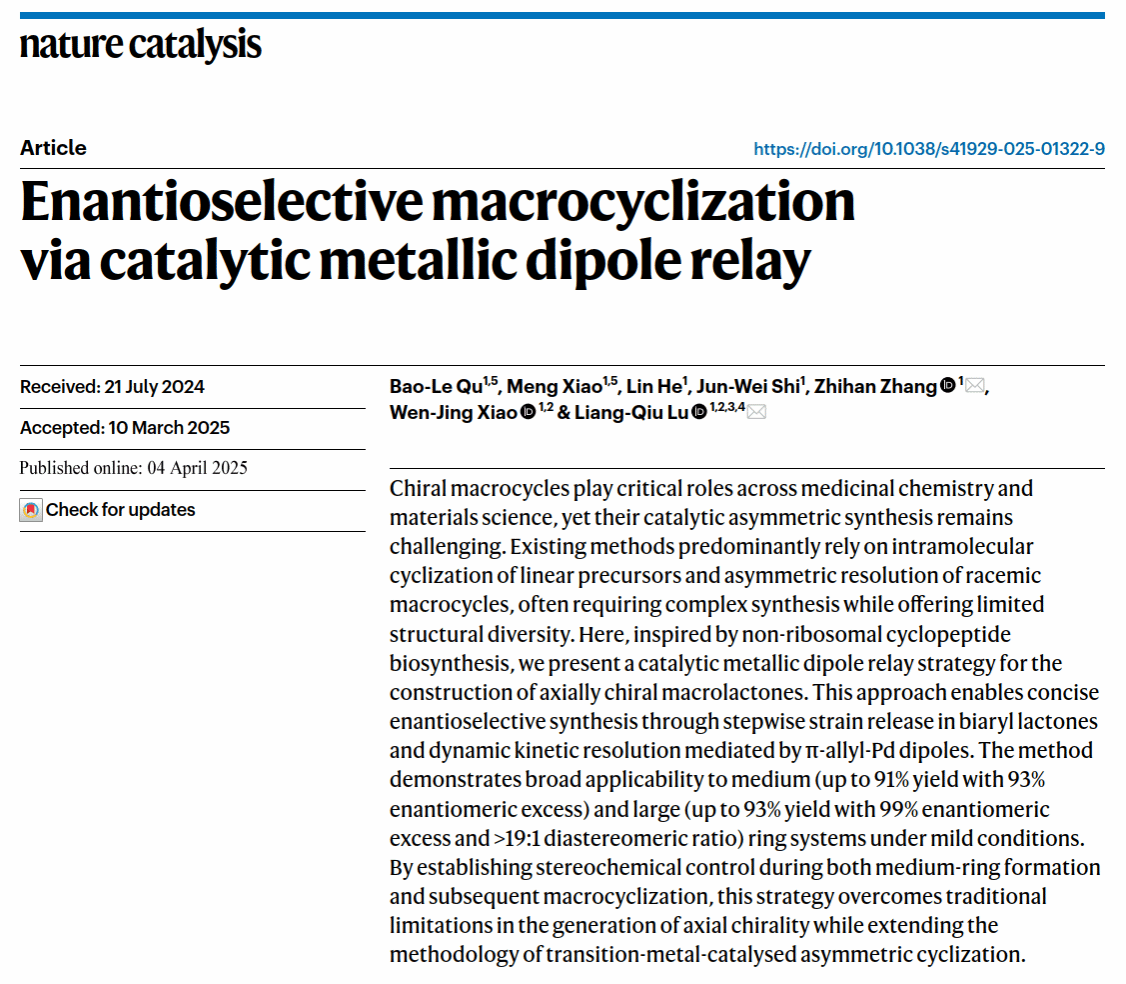 华大在线讯(通讯员 周汉鸣)4月4日,我校化学学院肖文精教授团队在国际顶级期刊《自然催化》(Nature Catalysis)发表题为"催化的金属偶极体接力实现对映选择性大环化"(Enantioselective macrocyclization via catalytic metallic dipole relay)的研究论文。该研究创新性地提出了"金属偶极体接力"策略,为轴手性大环化合物的高效合成开辟了新路径。雷速体育网页版登录入口博士研究生曲宝乐(实验研究)和肖萌(理论计算)为共同第一作者,陆良秋教授和张之涵教授为共同通讯作者,我校为第一完成单位。